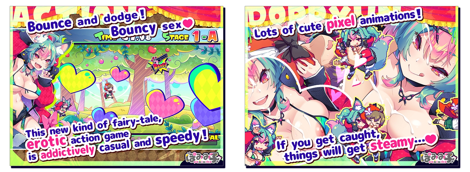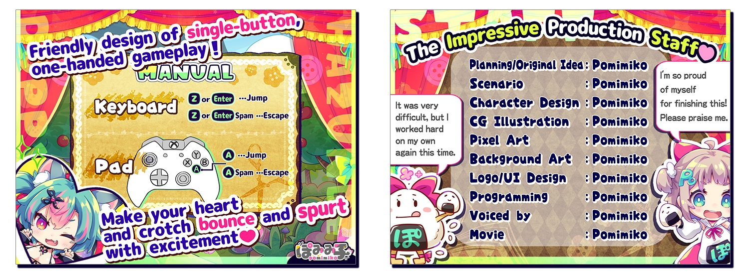 – Genre: A 2D side-scrolling single-button action game of tag that makes your heart and crotch bounce.
