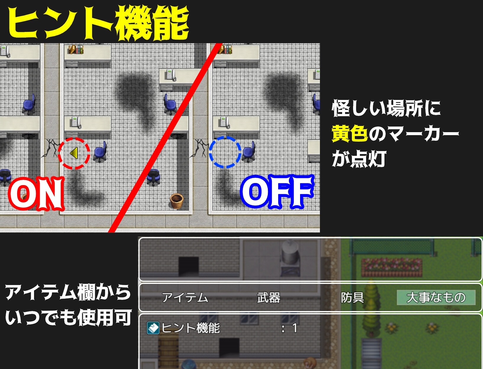サクサク進めたい方のためのヒント機能を今回も搭載! 「メニュー」→「アイテム」の「大事なもの」から ON/OFFがいつでも切り替えられます