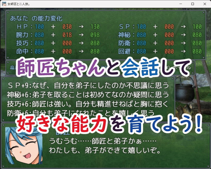 師匠ちゃんとの会話では、選択肢で進行! 好きな能力を育てよう!